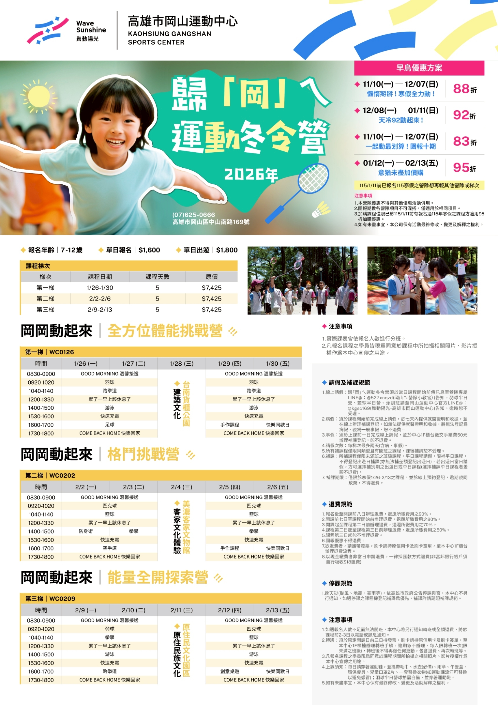| 梯次日期 | 第1梯 2026/01/26~01/30 第2梯 2026/02/02~02/06 第3梯 2026/02/09~02/13 |