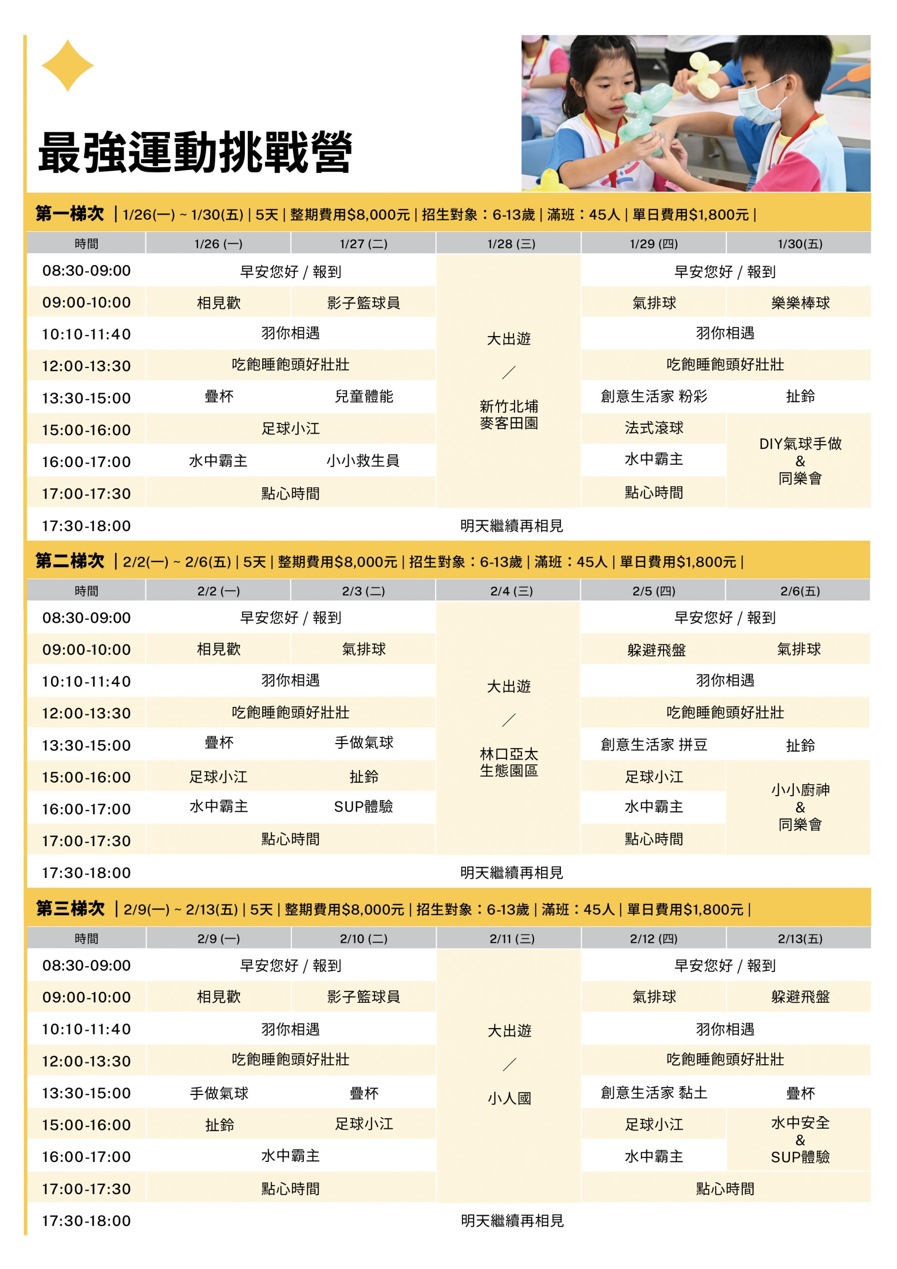 | 梯次日期 | 第1梯 2026/01/26~01/30 第2梯 2026/02/02~02/06 第3梯 2026/02/09~02/13 |